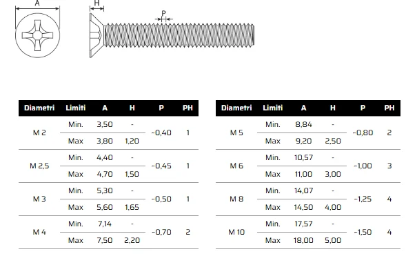La vite metrica testa svasata piana PH è un fissaggio standardizzato conforme alle normative DIN 965 / UNI 7688 / ISO 7046, ampiamente utilizzata in meccanica, carpenteria e montaggi di precisione. Grazie alla sua testa svasata, si inserisce a filo superficie, offrendo un risultato ordinato ed esteticamente pulito.